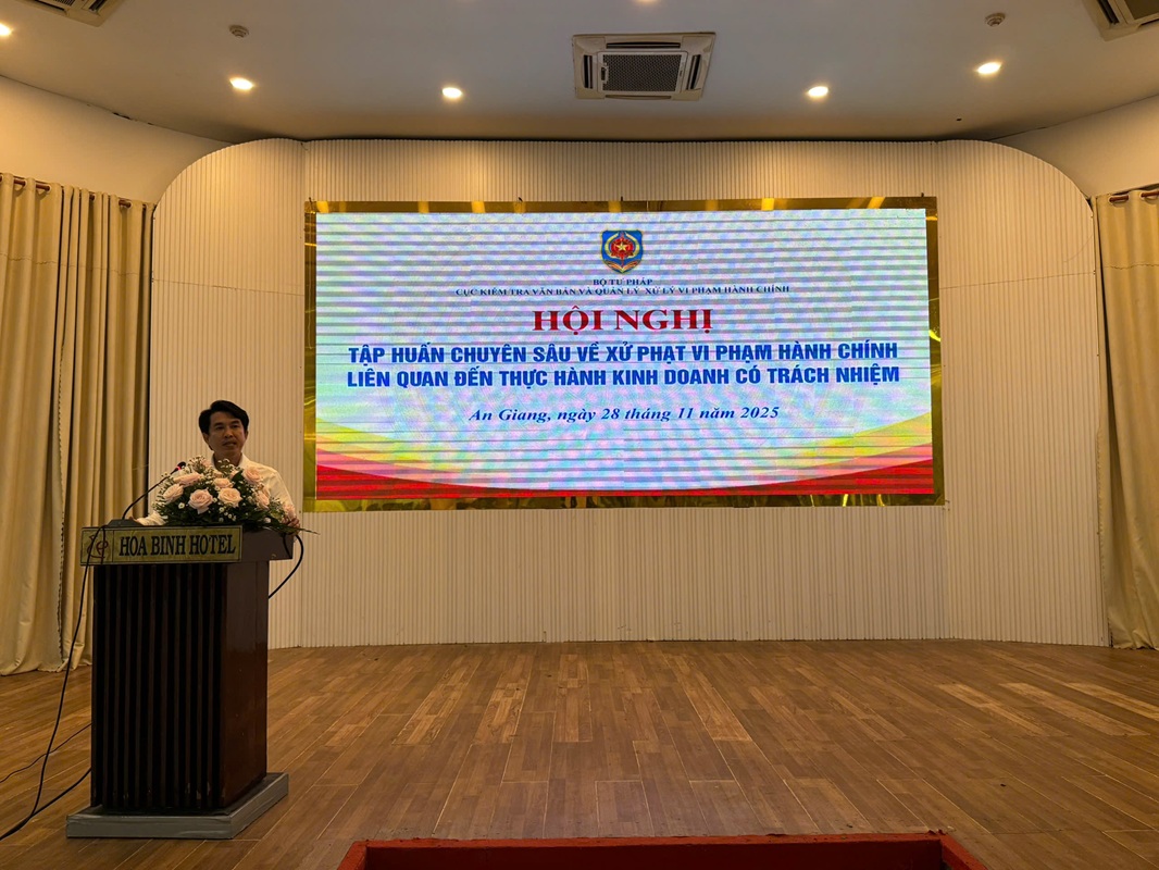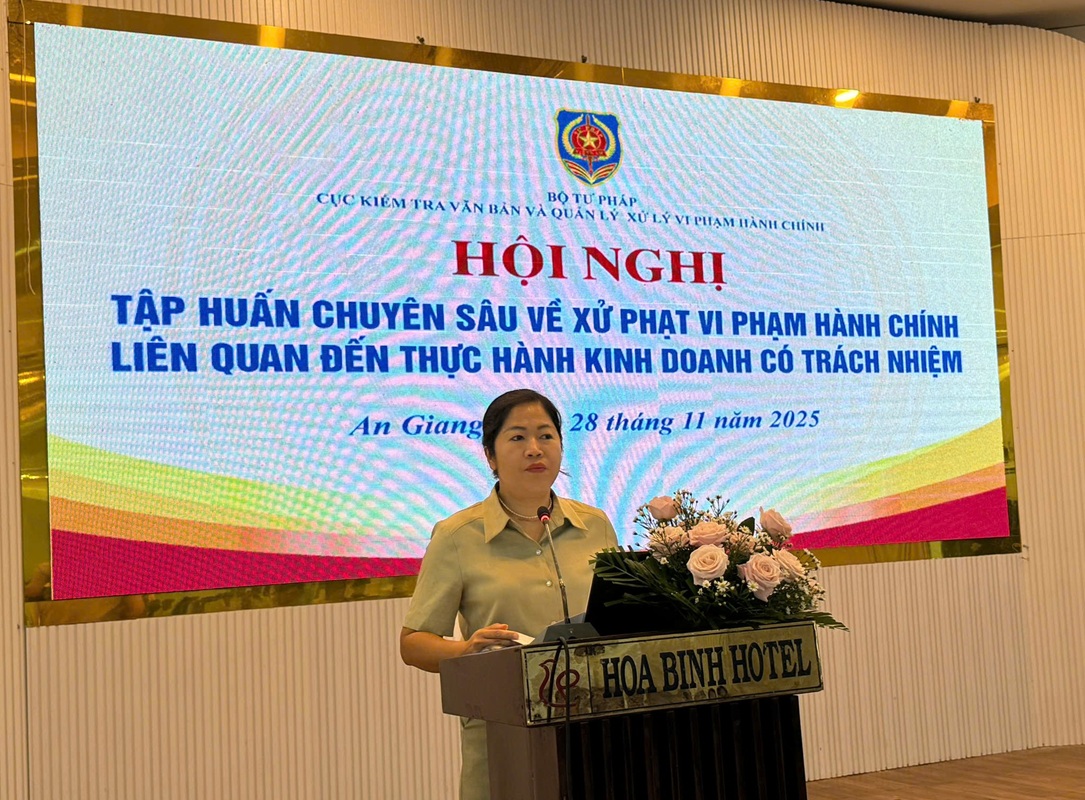 Thực hiện Kế hoạch triển khai Chương trình hành động quốc gia hoàn thiện chính sách và pháp luật nhằm thúc đẩy thực hành kinh doanh có trách nhiệm tại Việt Nam giai đoạn 2023 - 2027 của Bộ Tư pháp được ban hành kèm theo Quyết định số 2306/QĐ-BTP ngày 02/10/2023, vừa qua vào ngày 28/11/2025 tại phường Long Xuyên - tỉnh An Giang, Bộ Tư pháp đã tổ chức Hội nghị tập huấn chuyên sâu về kỹ năng xử phạt vi phạm hành chính.